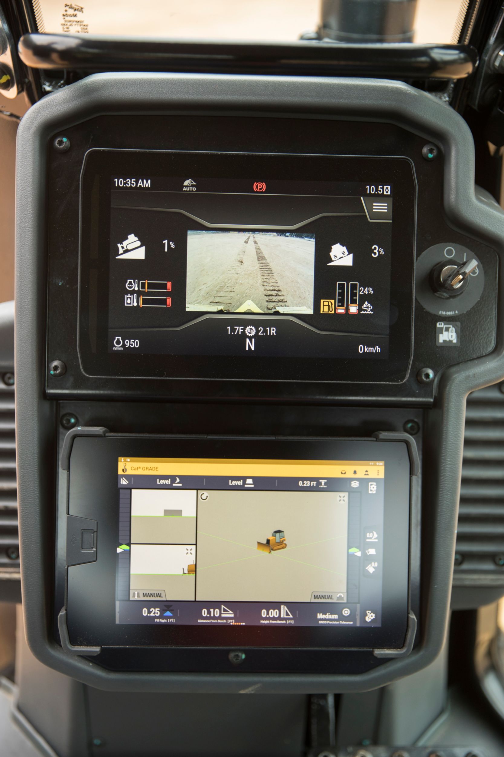 - This new and improved optional 10 in (254 mm) touchscreen, color display is easy to use, with a great view of machine settings, rearview camera and Slope Indicate/Slope Assist screens. The large reversing camera gives the operator better visibility to the job site.