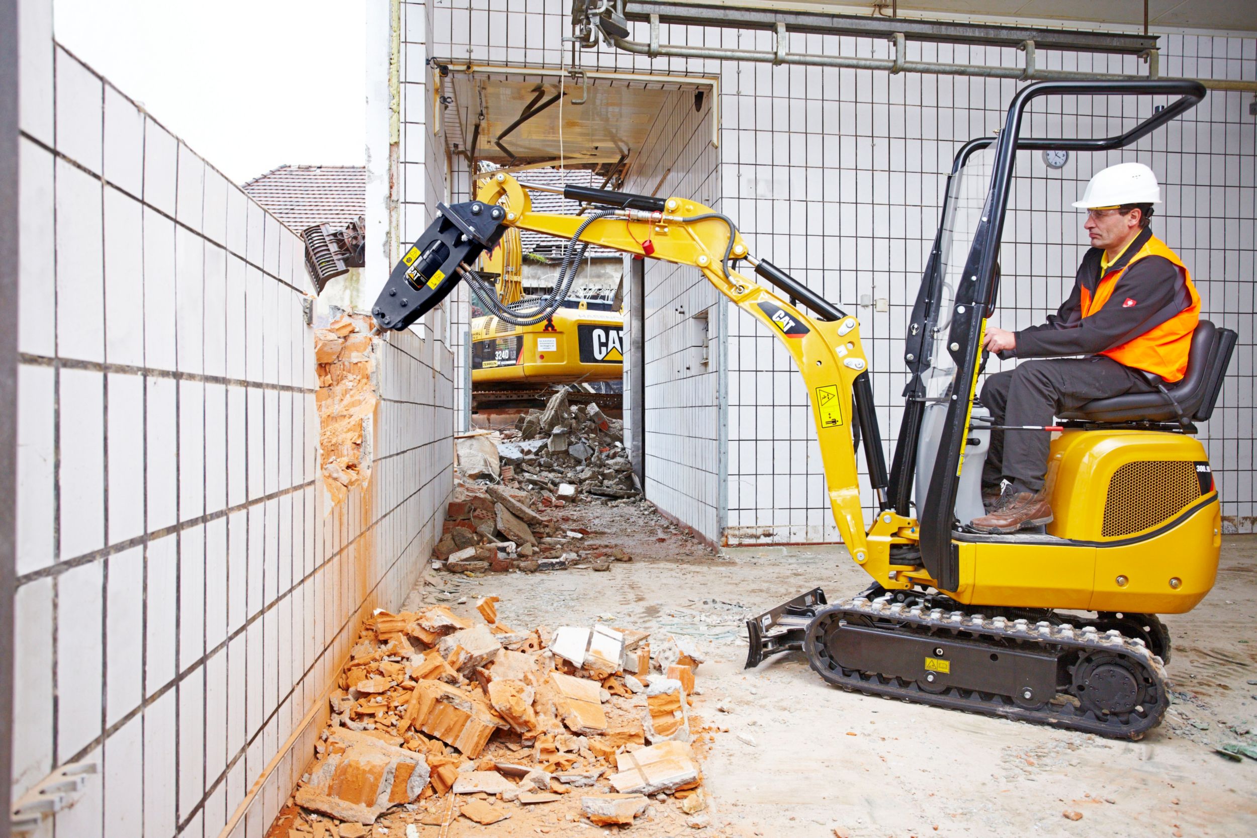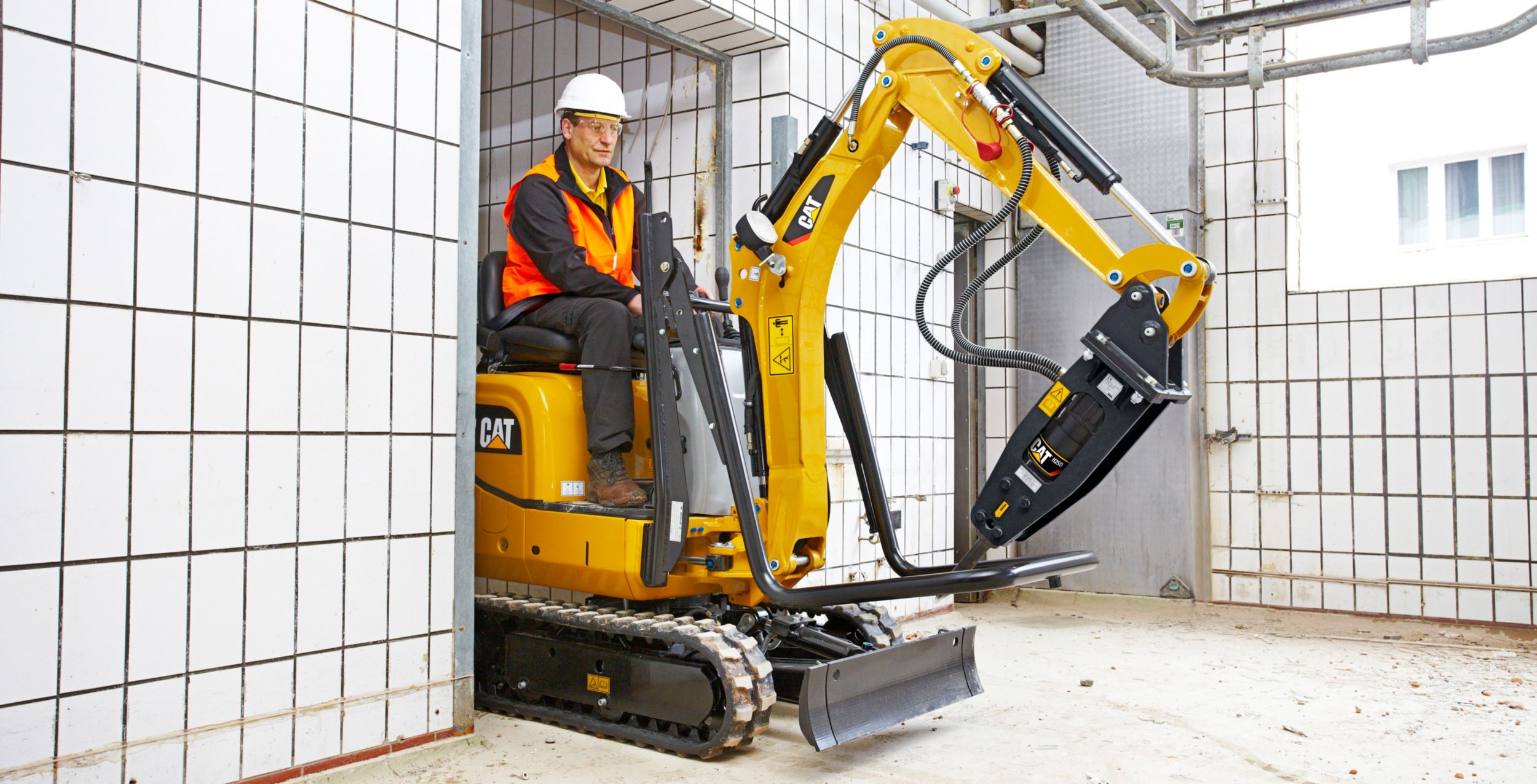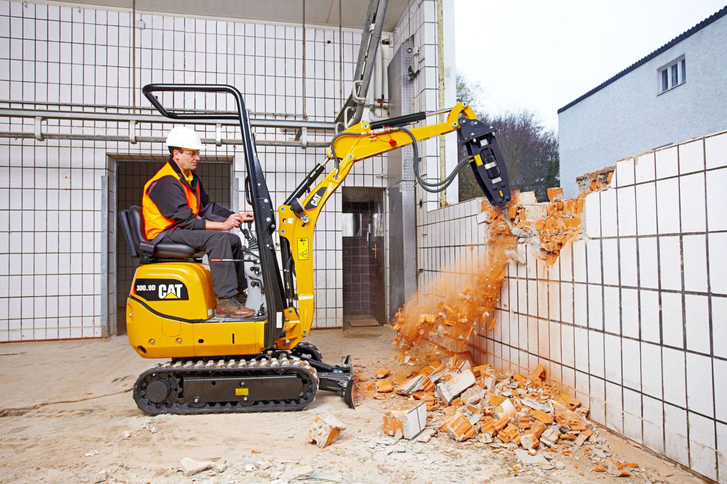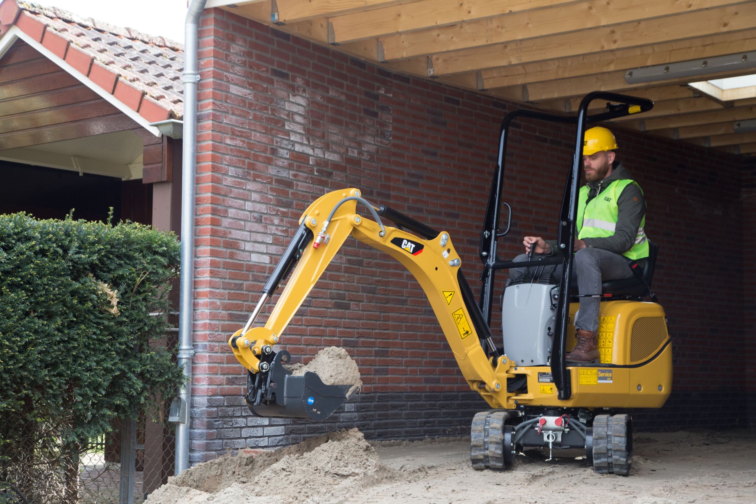 With an overall width of only 730 mm (2 ft 5 in) the Cat® 300.9D can easily drive through narrow passages and doors. Both indoor and outdoor jobs are now accessible with the under 1000 kg (2,205 lb) weight making easy trailer transportation between sites possible.