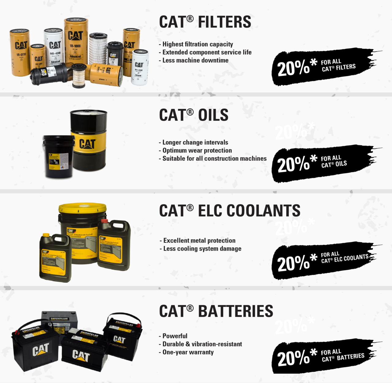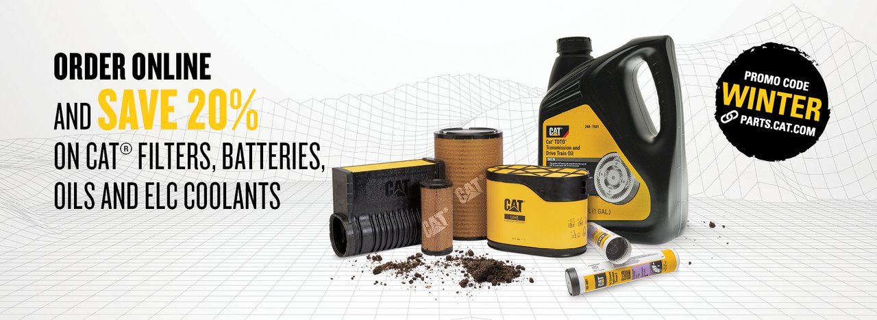 For a limited time, save 20%* when you order filters, batteries, oils, and coolants online through Parts.Cat.Com.