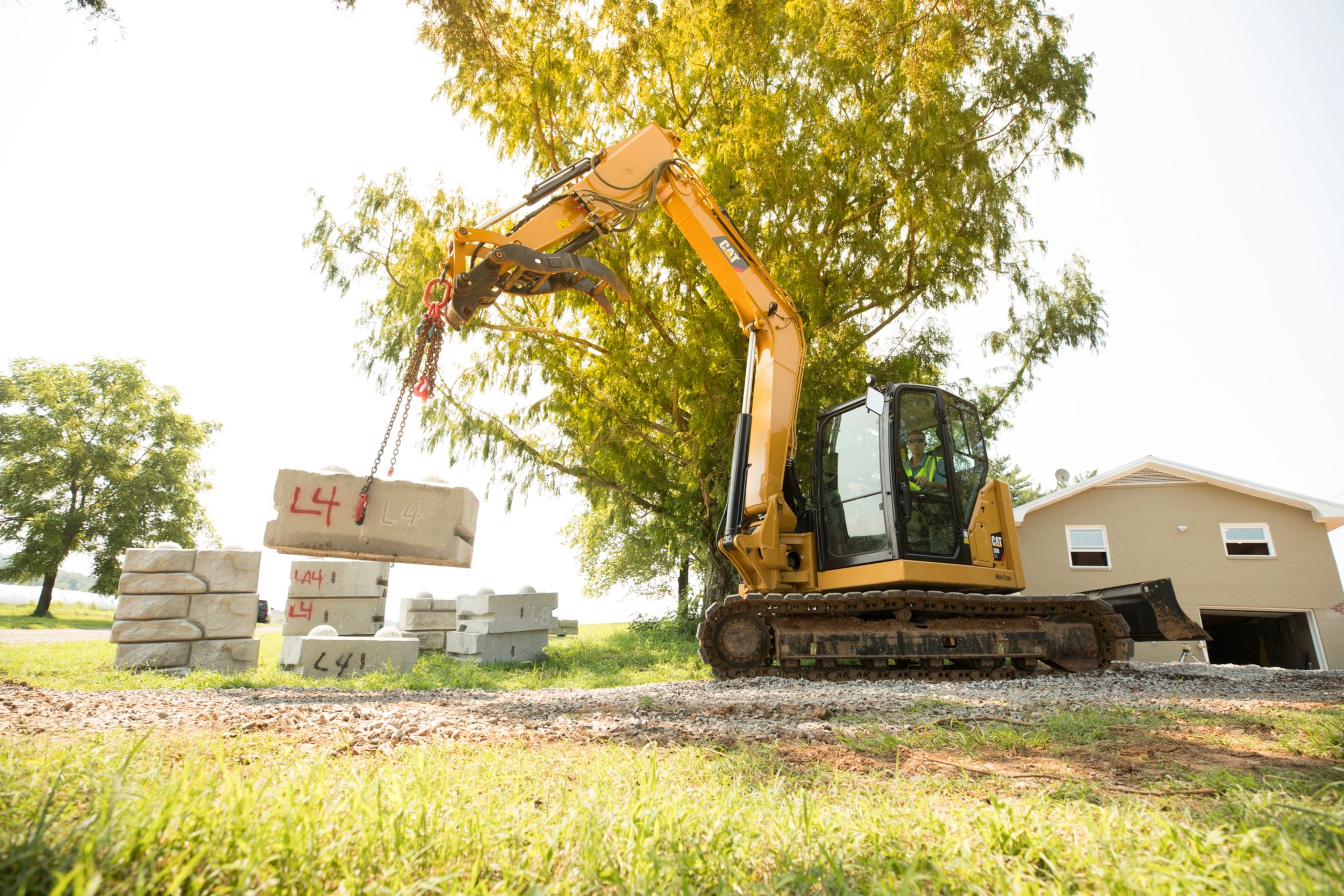 • Your safety is our top priority. The Cat Mini Excavator is designed to help keep you safe on the job. A back-up camera, courtesy work lights and a fluorescent retractable seat belt are just a few of the safety features we’ve built into the machine.